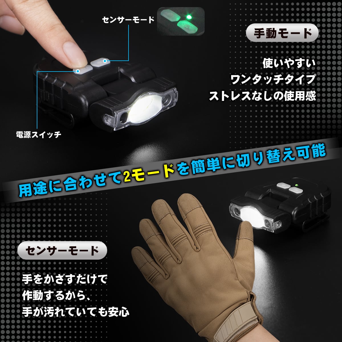 スイッチを押さなくても、ライト部分に手をかざすだけで