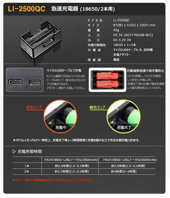 高性能なLi-2500QC!18650バッテリーに対応し、2本同時に充電可能です。日常の使用からアウトドアシーンまで幅広く活用できる、頼りになるアイテムです。